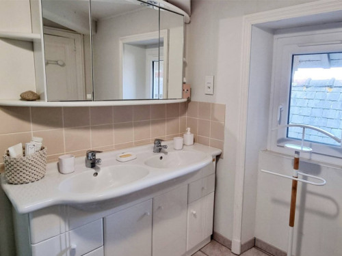 Le palier dessert également une salle de bain privative équipée d’une cabine de douche, deux vasques et d’un WC.