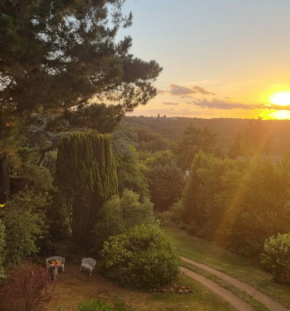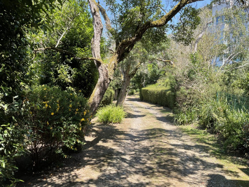 Derrière le portail, un grand parc arboré protège la maison du tumulte de la ville. On y entend les oiseaux, le vent dans les feuillages.